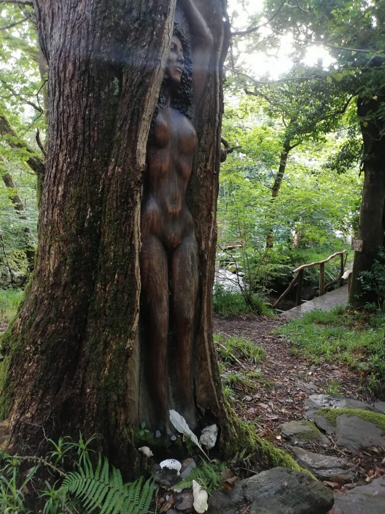 Sylvie Mombo : Avec un conte que je raconte depuis une vingtaine d’années, « Le Guerrier d’ébène » et dans lequel un arbre se transforme en être humain par amour pour une jeune femme, Matsang. Une première résonance avec le mythe de Jan où il est aussi question de transformation, en l’occurrence de la psyché de Ogboinba, qui de guérisseuse veut devenir mère. Mais il y eut une autre résonance, cette fois avec un arbre qui se trouve sur le site même de Cae Mabon où se déroulait la retraite : un arbre particulièrement majestueux, autant que celui de mon conte, et dans le tronc duquel est sculpté un personnage féminin. Une belle synchronicité s’il en est.