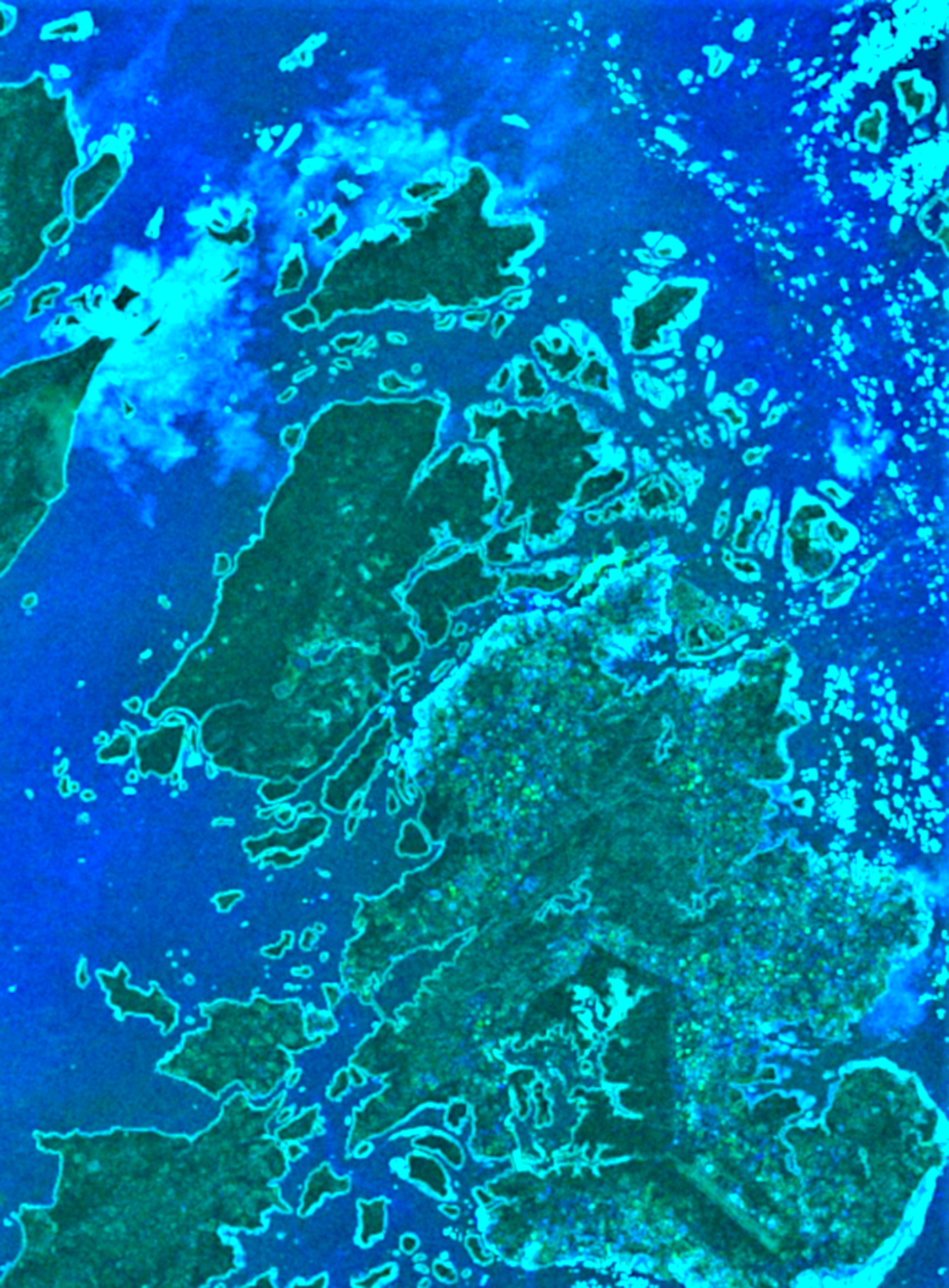 Cette composition colorée met en lumière les contours des îles indonésiennes de la province des Riau, au sud de Singapour. Elle résulte de la fusion de plusieurs images Sentinel-1, où les teintes de bleu et de vert traduisent des critères statistiques polarimétriques spécifiques. Ces couleurs ont été attribuées à deux mesures clés : les coefficients de variation temporels multivariés minimum et maximum, développés pour détecter les dynamiques de changement au sein des séries temporelles polarimétriques.