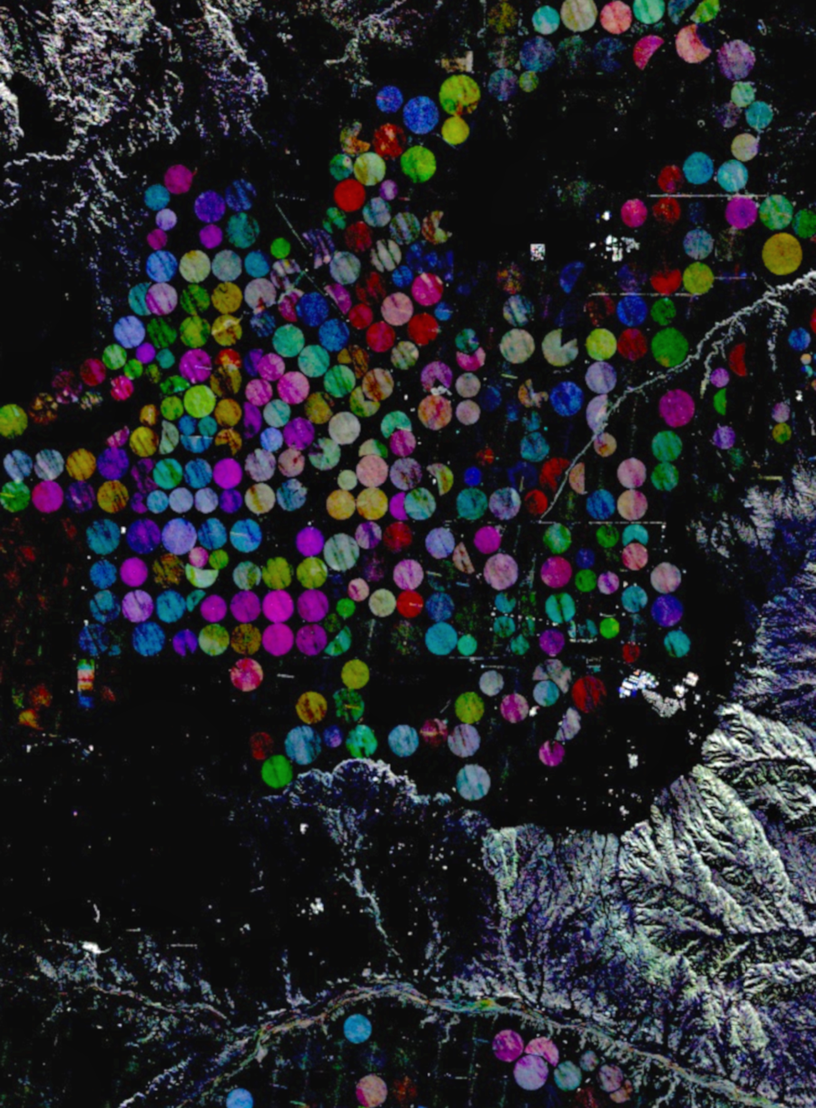 À grande échelle, l’agriculture est l’un des marqueurs les plus visibles des transformations rapides du territoire, avec ses cycles de croissance, de récolte et de régénération. Les formes circulaires emblématiques qui structurent cette image ne doivent rien au hasard : elles révèlent la signature d’une technique d’irrigation caractéristique, le pivot central. Ce dispositif, largement répandu aux États-Unis, fonctionne par rotation autour d’un point fixe, arrosant progressivement les parcelles en dessinant ces motifs géométriques.