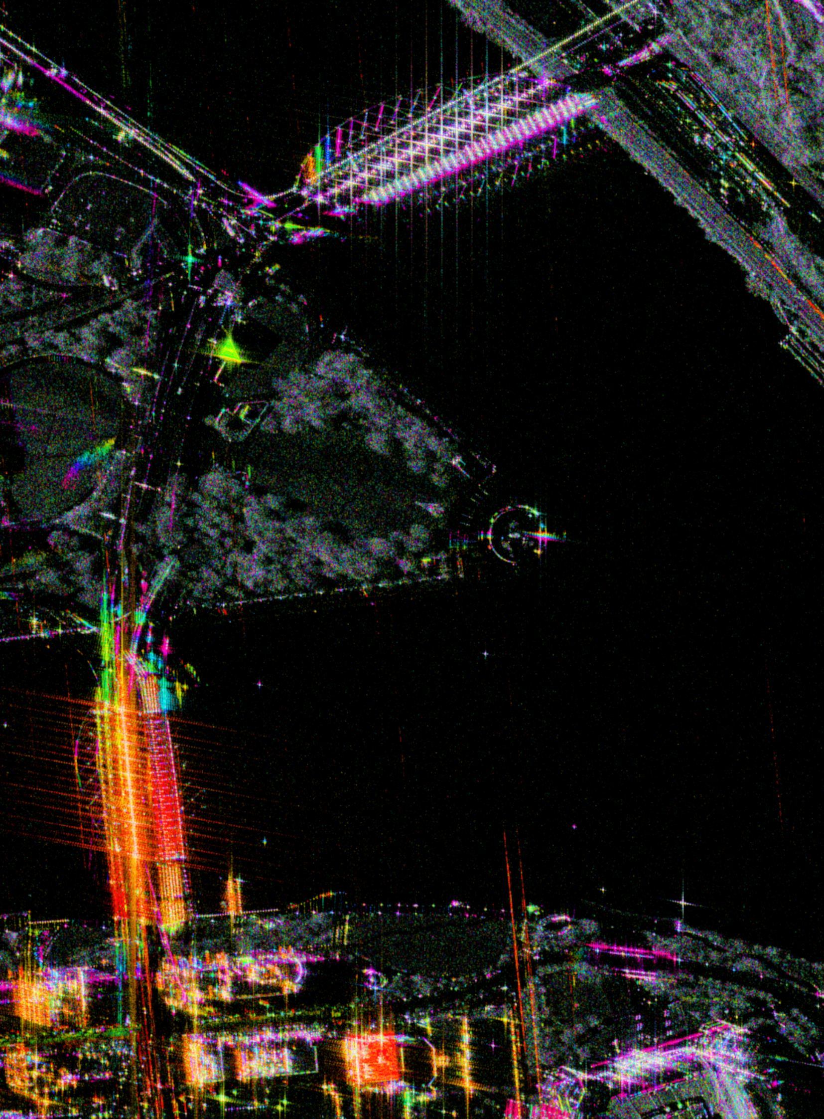 Grâce à la bienveillance et aux conseils avisés de mes interlocuteurs chez UMBRA, j’ai pu accéder à ces précieuses images, capturées avec une résolution remarquable de 50 cm par sous-ouverture. Pour réaliser cette composition, j’ai appliqué le procédé REACTIV, mais au lieu de comparer des dates d’acquisition différentes, j’ai choisi d’exploiter des angles d’observation légèrement variés afin de révéler les subtilités structurelles des ponts.