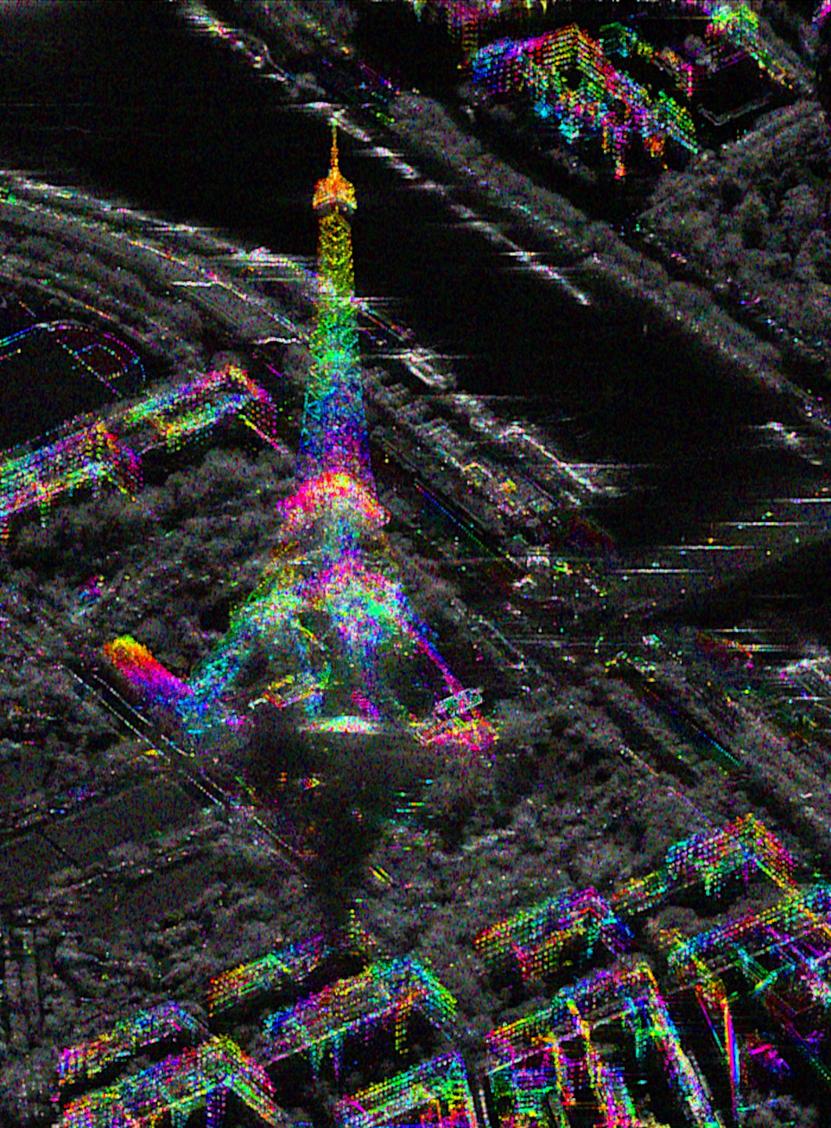 Cette image de la Tour Eiffel a été réalisée à partir d’une série de 24 images d’archives TerraSAR-X, acquises en mode staring spotlight, qui offre la résolution spatiale la plus fine disponible pour ce capteur. L’image finale résulte d’un traitement avancé, combinant une intensité filtrée temporellement, après un recalage précis des images effectué grâce à l’algorithme de flot optique Gefolki.