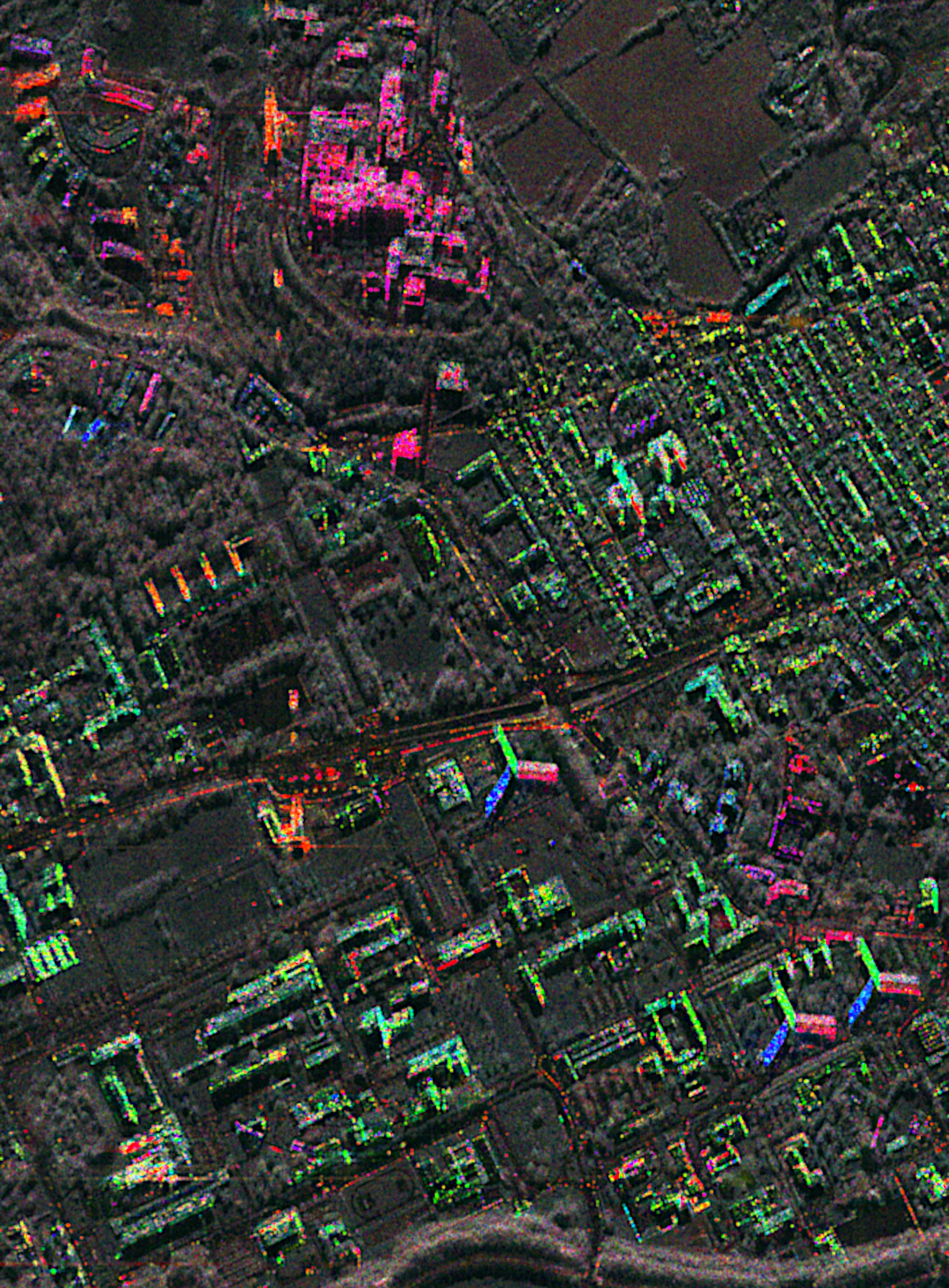 L’image a été réalisée à partir d’une série d’acquisitions des capteurs TanDEM-X (les deux jumeaux TerraSAR-X). La teinte des couleurs traduit l’orientation de l’ellipse polarimétrique, calculée à partir des canaux HH et HV, tandis que la saturation indique le degré de polarisation, mesuré sur la même série temporelle. Ce dernier paramètre atteste de la stabilité du comportement polarimétrique de rétrodiffusion des surfaces observées.
