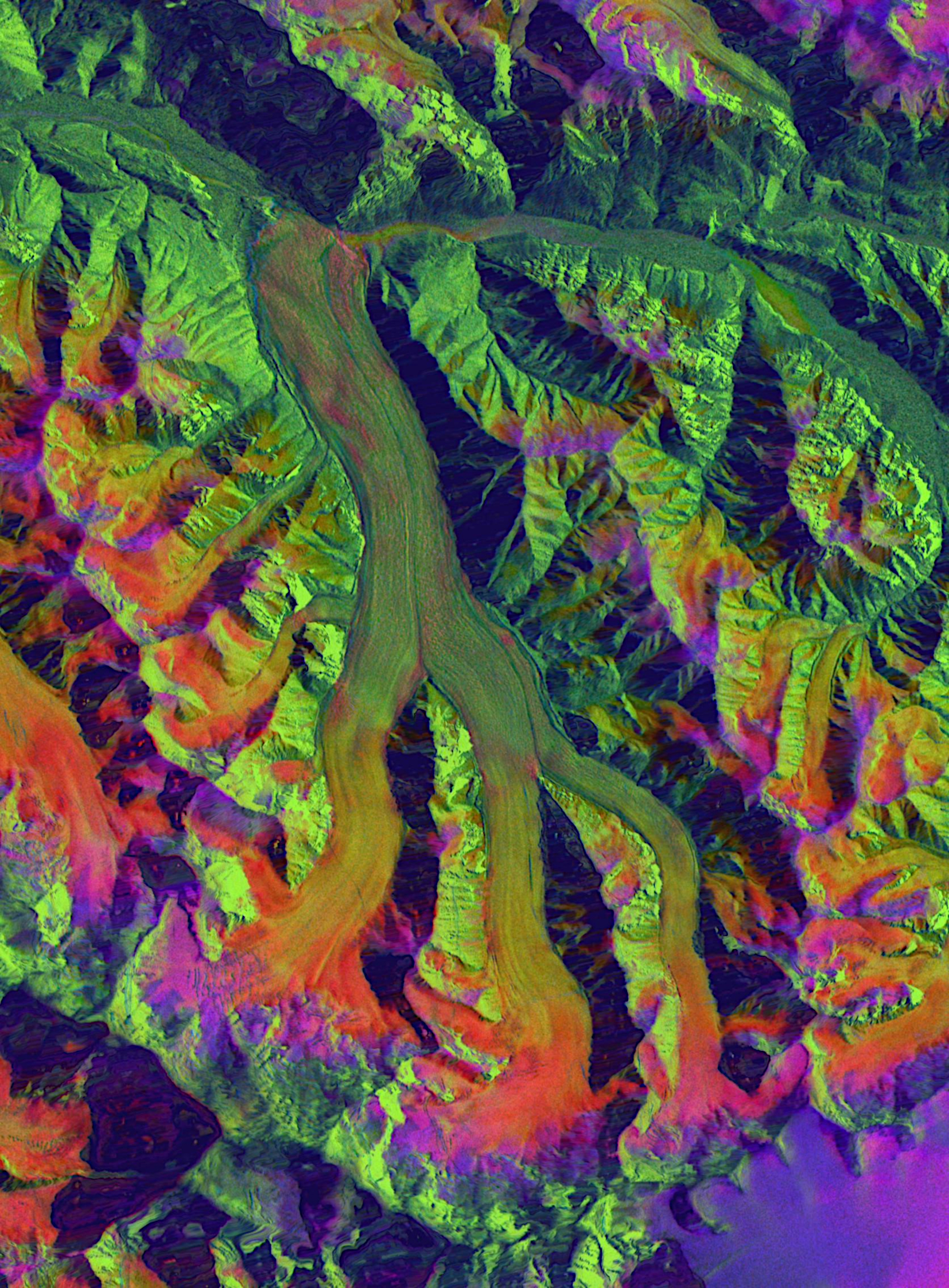 Cette image du glacier Kyagar, situé dans la chaîne de l’Himalaya, a été produite à partir d’une série temporelle d’images Sentinel-1.