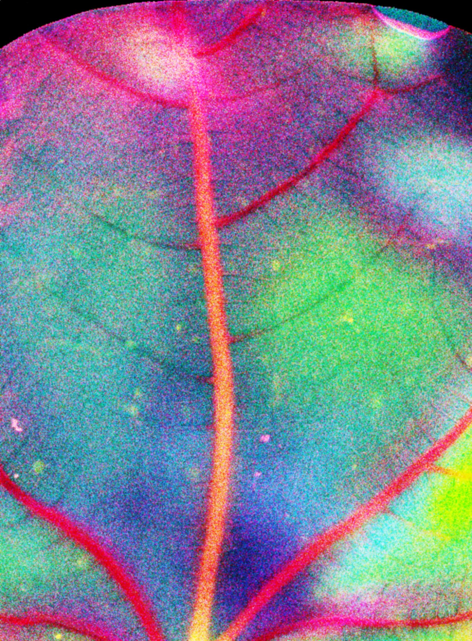 Elle a été réalisée à partir de l’observation de la feuille au cours du temps après sa coupe, grâce à un instrument laser de speckle dynamique développé par Xavier Orlik (Onera). Les trois couleurs primaires représentent les trois coefficients principaux obtenus par une analyse en composantes principales (ACP), appliquée aux coefficients de Fujii. Ces derniers sont des indices de contraste, calculés entre deux images successives, mesurant les corrélations d’intensité lumineuse, elles-mêmes reliées aux micro-mouvements internes de la feuille.
