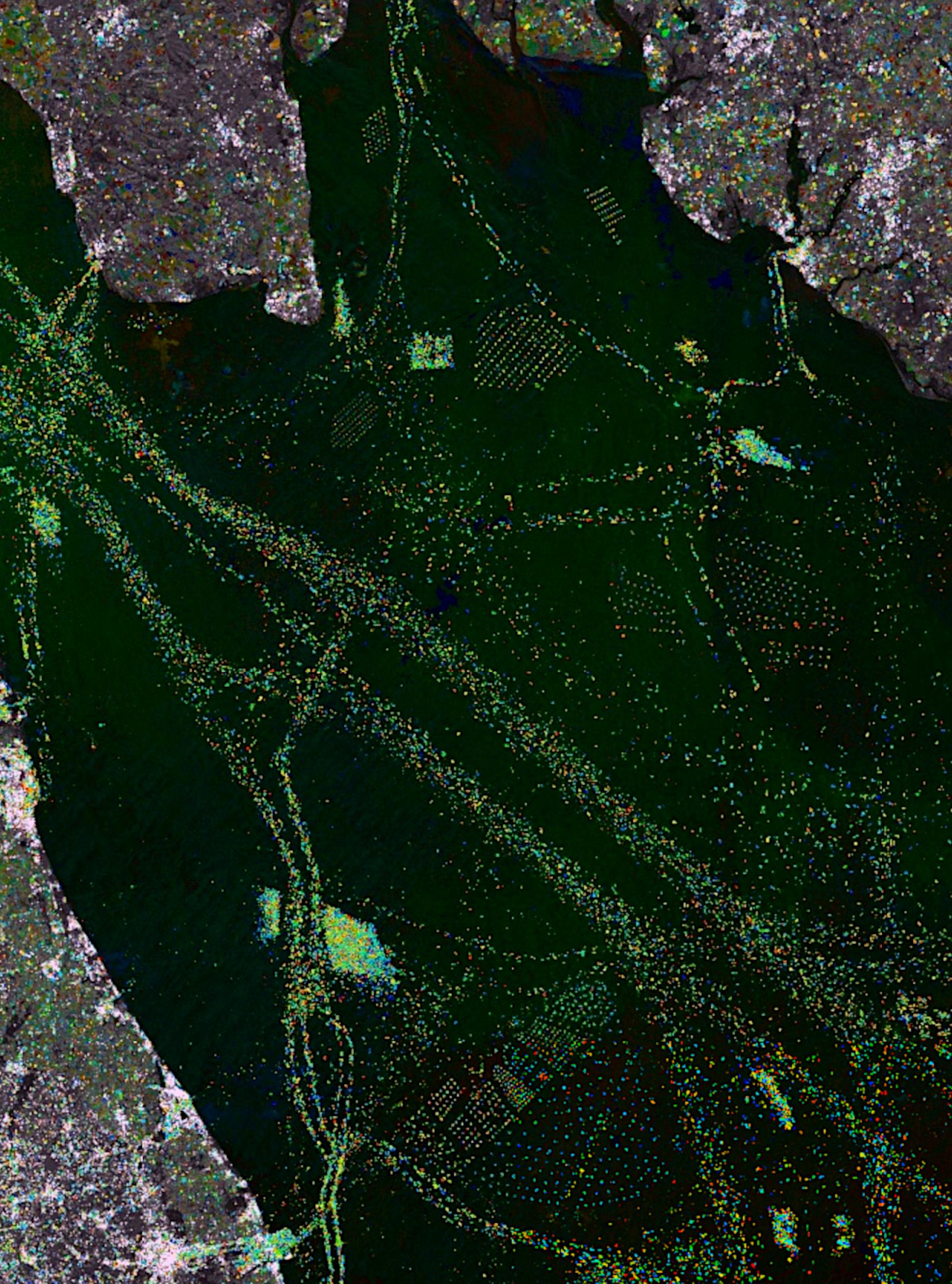 Cette image a été produite au large de La Haye, aux Pays-Bas. Les petits confettis colorés, alignés en deux lignes parallèles, correspondent à des bateaux en circulation, traçant de véritables routes temporelles sur la mer. Les amas de points signalent des zones de mouillage, où les navires stationnent plus longuement. Lorsqu’ils forment des motifs réguliers en réseau, ces points peuvent également correspondre à la présence de parcs éoliens offshore, organisés selon des grilles géométriques précises, dont le nombre s’est accru de manière spectaculaire ces dernières années.